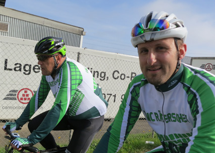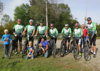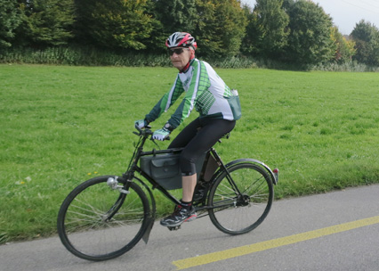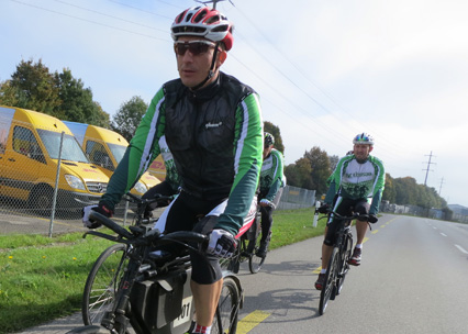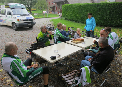 Kurz nach Oberbühren in Sonnental hatte Edi leider Pech. Er fuhr zuhinterst in der Gruppe und blieb unGlücklicherweise mit dem Pedal an einem sogenannten "Strassen-Veloweg-Trenn-Pfosten" hängen. Es rumpelte heftig! Mit schmerzverzehrtem Gesicht musste Edi sein Rad verladen. Somit wäre ein Rad frei geworden für unseren Präsi. Dieser konnte jedoch sein eigenes Rad auf mysteriöse Art und Weise wieder auf Vordermann bringen und in die Tour einsteigen.