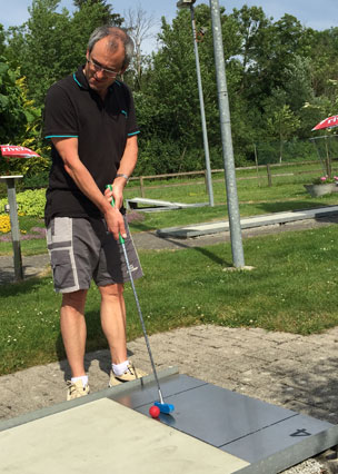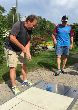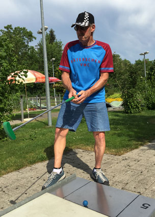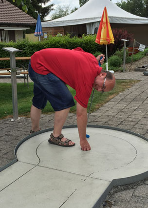 Heinz Steinemann konzentriert beim AbschlagWollte den Jungen zeigen wie es geht: Walter PfisterDie anderen Spieler werden genau analysiert (Walter Pfister und Edi Schärer)Edi Schärer bestimmt die Anschlagrichtung ganz genauAuch die "Kleinen" spielten mitFamilie Meier analysierte die Gegner aus dem SchattenHeiri Widmer fischt den Ball aus dem Loch