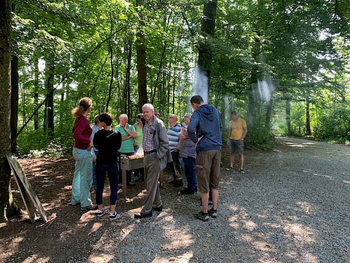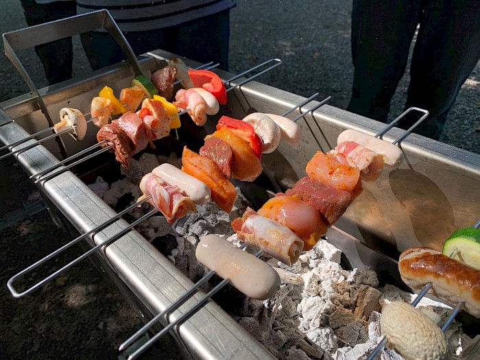 Die Geburtstagsfeier startete mit einem Apéro, bis die Glut des Feuers perfekt war. Dann konnten alle ihre eigenen Spiessli mit verschiedenen Fleischstücken, Gemüse, Käse und Pilzen bestücken und anschliessend über der Glut grillieren. Eine wirkoich tolle Idee mit feinen Zutaten, die den Teilnehmern zu schmecken schien. Denn am Schluss war das Buffet fast leer.