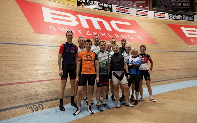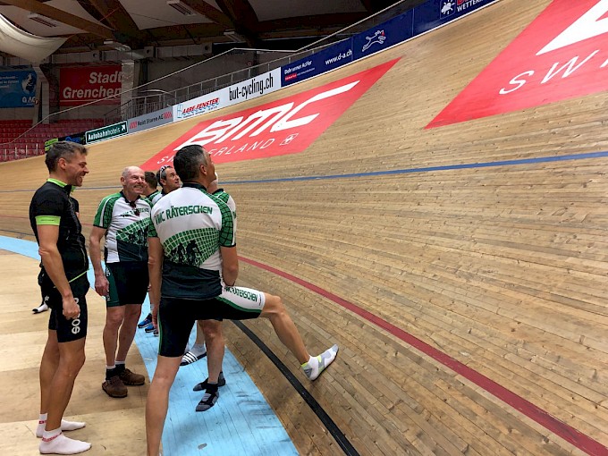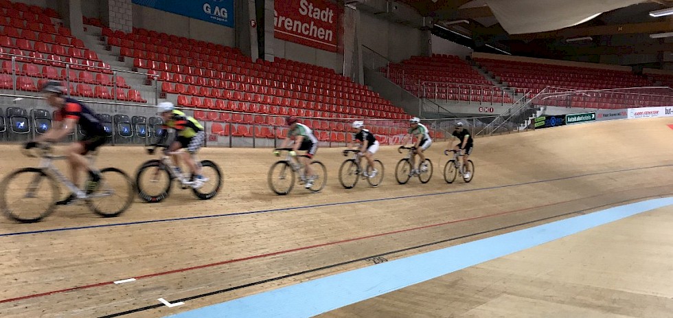 Nach verschiedenen Übungen waren dann alle bereit um zusammen die Runden auf der Bahn zu fahren. Neben dem «Rundengewinn», bei dem einige erfahren mussten, dass zwei drei Runden alleine sehr hart sind, fuhren wir auch noch ein Vierer-Mannschaftszeitfahren. Wobei sich die eine Gruppe mit einem Blitzstart gleich eines Fahrers entledigte, ihm war es schlicht weg zu schnell, den anderen Schlussendlich auch. Den Abschluss bildete noch ein «Balustradenfahren» und ein Ausscheidungsfahren, bis fast alle platt waren.