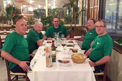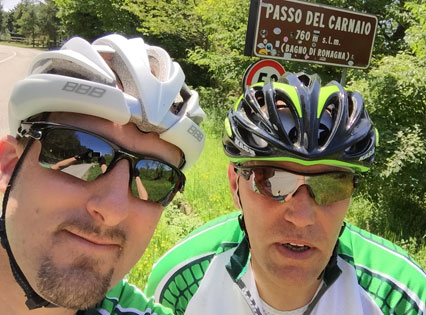 Selfie vor dem Pantani-Denkmal: Peter Heydecker, Heinz Steinemann, Edi Schärer und Thomas AndereggBeweisbild: Thomas Anderegg und Peter Heydecker waren auf dem Pass del CarnaioFiletto Angus: Feines Nachtessen nach dem strengen TagLiessen es sich gut gehen beim Nachtessen: Peter Heydecker, Edi Schärer, Thomas Anderegg, Walter Pfister und Heinz Steinemann