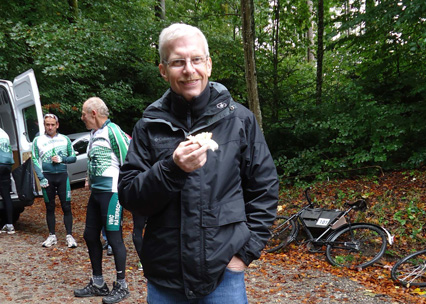 Die Verpflegung wirkte bei den einen und so wurde die Gruppe wieder auseinander gerissen. Die erste Aufholjagt hatte begonnen. Nach Sirnach war das Feld wieder zusammen und die Steigung auf den Rüetschberg stand schon bald auf dem Programm. Es ist eifach toll, wenn man mit dem einen Gang, den das Militärrad hat, so langsam unterwegs ist, dass man fast Angst haben muss, dass man das Gleichgewicht verliert und um fällt. Oben angekommen wurden wir mit Kaffe und Kuchen von unseren Begleitern Walter Pfister und Torsten Gebhardt erwartet.