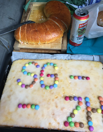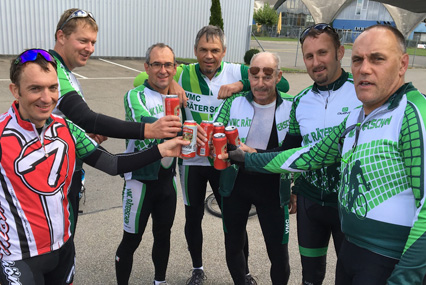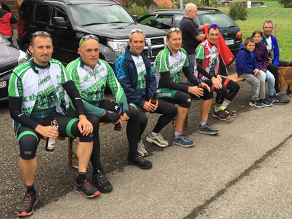 Oben angekommen, warteten die Helfer und wir konnten eine erste Pause geniessen und uns mit feinem Zopf, Sandwiches, Kuchen und Getränken verpflegen. Nun kam auch noch die Sonne hervor und die Strasse fing langsam an zu trocknen. Frisch gestärkt fuhren wir dann alle weiter in Richtung Turbenthal. Eine gute Strecke um gemeinsam in der Gruppe zu fahren. Dachte man! Doch wo ist Thomas? Nein, er musste nicht abreissen lassen, sondern hatte etwas verloren ... Alle wieder zusammen, fuhren wir dann in Richtung Wildberg nach Russikon, wo nochmals eine kurze Rampe auf uns wartete und der eine oder anderer doch schon schwere Beine hatte. Aber wie wir ja wussten, war es von dort her nicht mehr weit bis Ottikon. Mit Edi an der Spitze fuhren wir in Ottikon ein. Beim Schützenhaus gab es nochmals eine kleine Stärkung, so dass alle das Finale in Angriff nehmen konnten.