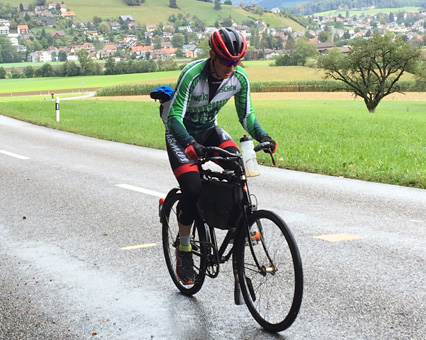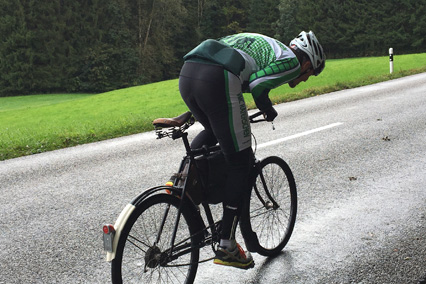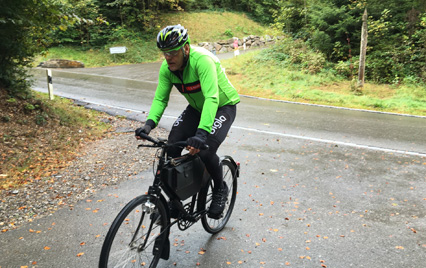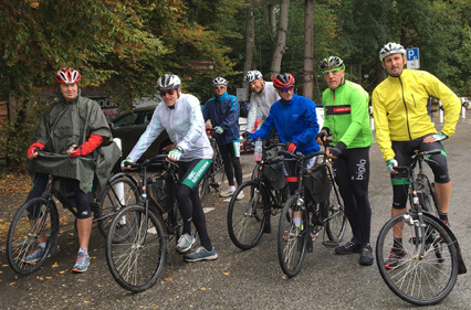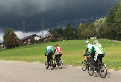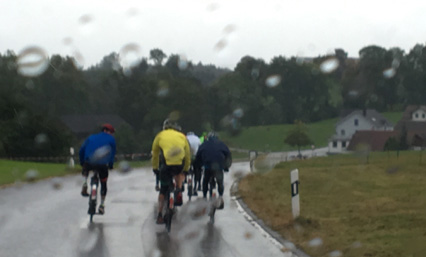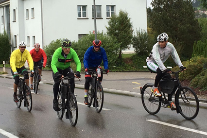 Da vorerst keine Wetterbesserung in Sicht war, fuhren wir also im Regen und im Gegenwind los in Richtung Dübendorf. Kurz nach Gossau ging es dann auch schon mit der ersten Steigung in Richtung Andwil los, wo die Gruppe schon auseinandergezogen wurde. Oben, wieder alle zusammen, fuhren wir geschlossen in Richtung Niederbüren. Dort konnte Thomas zum ersten Mal kurz seine Bremsen testen. Gemeinsam ging es weiter Richtung Oberbüren. Dort in den Kreisel eingefahren gab es einen kurzen Schreckmoment für Hägi und Stefan. Synchron rutschten beide Velos im Kreisel zur Seite. Buh, nichts passiert! Da dieses Jahr niemand in Sonnental zu Hause war, fuhren wir direkt weiter in Richtung Wil. Bereits jetzt wurde das Wetter besser und in Niederstetten wurden darum die ersten Kleider gewechselt. In Wil angekommen ging es weiter in Richtung Sirnach. Dieses Jahr kamen aber alle gut durch den Kreisel.