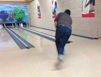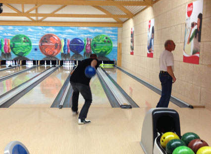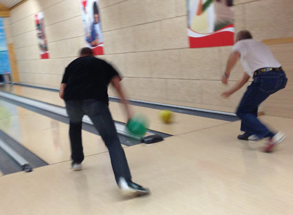 Peter Heydecker setzt elegant zum Wurf an und Edi "dä vo frühener" Schärer (rechts) interessiert das sehr wenigGemeinsamer Wurf von Peter Heydecker und Edi Schärer. Wer hat mehr Pins umgeworfen?Frauen-Power auch beim Bowling: Denise Lingua beim AnlaufWird auch der letzte Pin umfallen? Patrik Ettlin beim zweiten Versuch